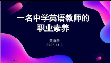 為提高英語師范生的專業(yè)素養(yǎng),湖北大學(xué)外國語學(xué)院師范生專業(yè)人才培養(yǎng)模式虛擬教研室邀請宜昌市中學(xué)英語高級教師和教研員黃海燕老師于2022年11月3日為全體師范生進(jìn)行線上講座。講座的主題為:一名中學(xué)英語教師的職業(yè)素養(yǎng)。