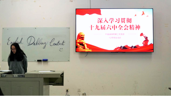 為進一步學習貫徹十九屆六中全會精神, 12月22日,外國語學院學生第二黨支部在逸夫樓1010教室舉行12月主題黨日示范活動,學院組織員黎鳳蓮、各學生支部代表參加學習。