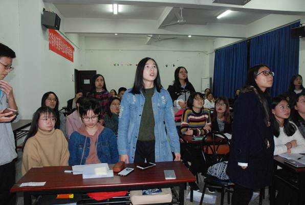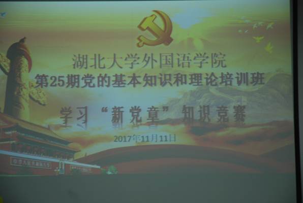 為了深入學(xué)習(xí)黨的十九大報(bào)告,切實(shí)貫徹、堅(jiān)決維護(hù)黨章,學(xué)會用黨章武裝頭腦、規(guī)范行為、指導(dǎo)黨的建設(shè)和工作,湖北大學(xué)外國語學(xué)院于11月11日晚18:30在逸夫樓A1010舉行了學(xué)習(xí)“新黨章”知識競賽,第25期黨的基本知識和理論培訓(xùn)班36名成員參與該活動。本次競賽共計(jì)5組參賽隊(duì),分別為大英語黨支部A組、大英語黨支部B組、小語種黨支部C組、小語種黨支部D組、研究生+學(xué)生組織黨支部E組,每組3人。培訓(xùn)班其他學(xué)員均為觀眾。