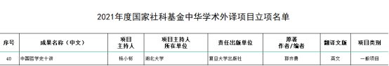 近日,2021年度國(guó)家社會(huì)科學(xué)基金中華學(xué)術(shù)外譯項(xiàng)目立項(xiàng)名單公布,湖北大學(xué)外國(guó)語學(xué)院楊小彬教授主持的《中國(guó)哲學(xué)史十講》(英文版)入選。