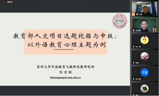 11月23日,蘇州大學(xué)劉宏剛教授應(yīng)學(xué)院邀請(qǐng),以“外語(yǔ)教育心理”主題為例,為學(xué)院教師作“教育部人文項(xiàng)目選題挖掘與申報(bào)”專(zhuān)題學(xué)術(shù)講座。講座采用線上的方式進(jìn)行,由學(xué)院副院長(zhǎng)呂奇教授主持,60余位教師參加講座。