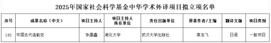 近日,全國(guó)哲學(xué)社會(huì)科學(xué)工作辦公室公布了2025年國(guó)家社會(huì)科學(xué)基金中華學(xué)術(shù)外譯項(xiàng)目擬立項(xiàng)名單,湖北大學(xué)外國(guó)語(yǔ)學(xué)院張晶鑫副教授主持的《中國(guó)古代造船史》(日文版)入選。