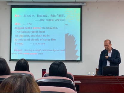 本次講座,張保紅教授主要從繪畫形式語言要素(如點、線、面、光、色、形、體等)及其原理、技巧出發(fā),探討中西繪畫藝術(shù)于古詩英譯選詞造句、謀篇布局的獨到使用價值與跨藝術(shù)理論創(chuàng)新意義。
