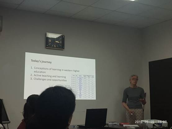 在第一部分中,Donna Hurford博士首先向在場(chǎng)師生拋出一個(gè)有趣的學(xué)術(shù)問(wèn)題:“歐洲,美國(guó)等西方國(guó)家學(xué)生的求學(xué)目的與中國(guó)學(xué)生的求學(xué)目的有和不同”,頓時(shí)引來(lái)了全場(chǎng)的熱烈討論,接著為了解答她提出的問(wèn)題,Donna展示一些研究數(shù)據(jù),并對(duì)此問(wèn)題做了合理的解答。為了大家能更好的了解這方面的知識(shí),Donna也向在場(chǎng)師生推薦了Yang Liu 的East meets west 和Jin Liu 的Cultural Foundations of Learning等書(shū)籍。接著Donna提到了教學(xué)領(lǐng)域耳熟能詳?shù)?span lang="EN-US">Constructivism and Social Constructivism, Piaget的Assimilate and Accommodate, Kolb的 Learning Cycle, Vygostky的ZPD等等經(jīng)典理論,并提出了她自己的見(jiàn)解。