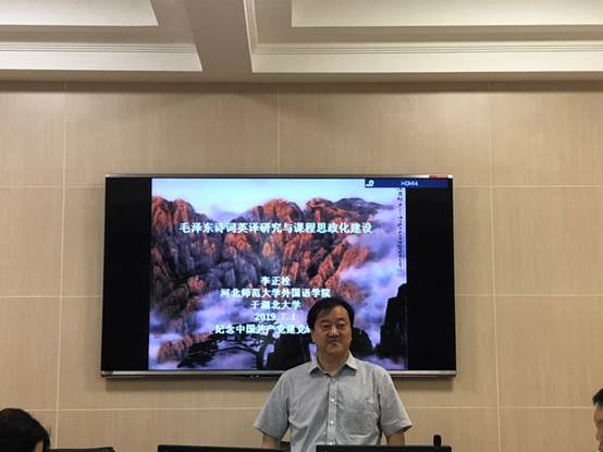 2019年7月1日,湖北學(xué)逸夫人文樓A5002室,正值中國共產(chǎn)黨九十八歲生日之際,湖北大學(xué)外國語學(xué)院特邀河北師范大學(xué)外國語學(xué)院李正栓教授作題為《毛澤東詩詞英譯研究與課程思政化建設(shè)》的學(xué)術(shù)講座,慶祝中國共產(chǎn)黨的生日,懷念黨的偉大領(lǐng)袖毛澤東,并深入探討對毛澤東詩歌的英譯問題。此次講座在逸夫人文樓A5002室舉行,由外國語學(xué)院殷燕教授主持。