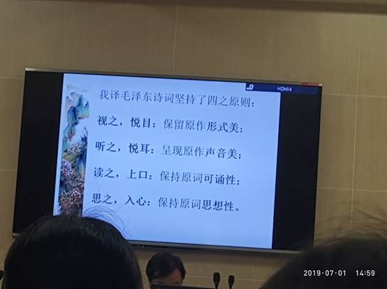 在談到“聽之,悅耳:呈現(xiàn)原作聲音美” 的原則時。李教授以毛澤東的名篇《減字木蘭花》為例,提出了用湖南方言朗誦此詞將會得到不一樣的朗誦效果,這給大家在研究“毛澤東詩詞英譯”方面提供了新的視角。對于“詩詞的英譯是否一定要押韻”這個爭議不斷的學(xué)術(shù)問題,李教授有自己的堅持,他認為“可以押韻就押韻,不能押韻就不要強求”。在對毛澤東詩詞的中英譯本進行比較時,李教授鼓勵在場的老師和同學(xué)們可以通過反復(fù)朗誦來感受詩歌的節(jié)奏和律動,并以“聽著是否悅耳”作為判斷譯文好壞的重要標準之一。在有感于偉人文采時,李教授經(jīng)常停下來帶大家一起朗誦并體會偉人創(chuàng)作時思想,他主張,朗誦在毛澤東詩詞英譯的過程中也有著很大幫助。