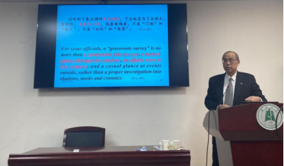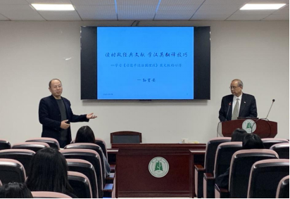 為深入貫徹落實(shí)教育部《高等學(xué)校課程思政建設(shè)指導(dǎo)綱要》,進(jìn)一步落實(shí)立德樹(shù)人的根本任務(wù),把思想政治教育貫穿人才培養(yǎng)體系,深入推進(jìn)學(xué)院課程思政建設(shè),11月19日,學(xué)院特邀省教育專(zhuān)家、湖北省教育廳原副巡視員孫望安,為學(xué)院師生開(kāi)展題為“讀時(shí)政經(jīng)典文獻(xiàn),學(xué)漢英翻譯技巧——學(xué)習(xí)《習(xí)近平談治國(guó)理政》英文版的心得”的學(xué)術(shù)講座。本次講座在逸夫人文樓A2014舉行,由外國(guó)語(yǔ)學(xué)院副院長(zhǎng)楊小彬教授主持。