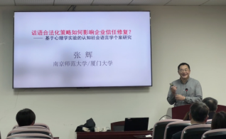 11月15日,南京師范大學(xué)張輝教授應(yīng)學(xué)院邀請(qǐng),為學(xué)院師生作題為“話語(yǔ)合法化策略如何影響企業(yè)信任構(gòu)建與修復(fù)——一項(xiàng)基于心理學(xué)實(shí)驗(yàn)的批評(píng)認(rèn)知語(yǔ)言學(xué)個(gè)案研究”的學(xué)術(shù)講座。本次講座在逸夫人文樓A2014舉行,由學(xué)院副院長(zhǎng)呂奇教授主持。