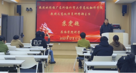 12月10日,廣東外語外貿(mào)大學(xué)蘇雯超教授應(yīng)學(xué)院邀請,為學(xué)院師生作題為“人工智能時(shí)代的認(rèn)知口譯研究”的學(xué)術(shù)講座。本次講座在逸夫人文樓A3014舉行,由翻譯與跨文化傳播研究所所長韓曉龍博士主持。
