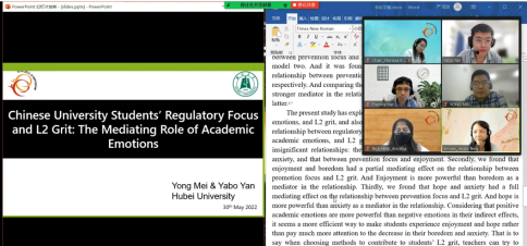 會上,梅勇老師與嚴亞波同學在“Teaching & Learning Strategies”板塊分會場作20分鐘主旨發(fā)言,共同介紹了他們的研究成果“Chinese University Students’ Regulatory Focus and L2 Grit: The Mediating Role of Academic Emotions”,并對與會學者提出的問題和困惑進行了解答和互動。
