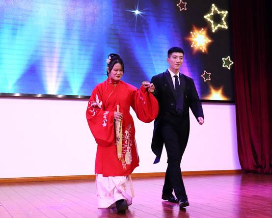 值得一提的是,中西經(jīng)典服飾走秀中,同學們展示了中外特色的服飾,有西裝革履,更有漢唐裙妝,臺下觀眾叫好聲不斷。