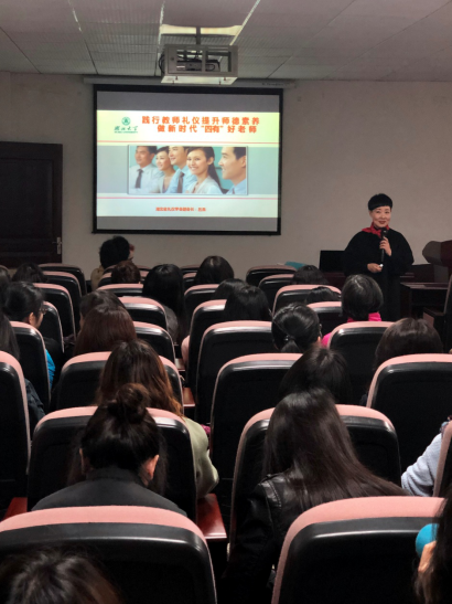 3月27日下午三點,學(xué)院開展“道德建設(shè)月”師德師風(fēng)建設(shè)活動,邀請湖北省禮儀學(xué)會副會長、國家注冊高級形象設(shè)計師呂燕在人文逸夫樓A2014為學(xué)院教師作題為《踐行教師禮儀 提升師德素養(yǎng) 做新時代“四有”好老師》講座。