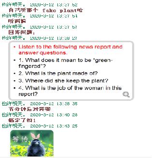 萬莎老師交流了她在線教學(xué)的一些做法。在視聽說學(xué)習(xí)上,萬老師利用教學(xué)平臺(tái)實(shí)施考勤簽到、問題討論等操作;課后,將學(xué)習(xí)材料及時(shí)發(fā)布至QQ群中,方便學(xué)生線上與線下相結(jié)合的深化學(xué)習(xí)。在綜合課程學(xué)習(xí)上,萬老師利用QQ群的“作業(yè)功能”,嚴(yán)格要求學(xué)生按時(shí)保質(zhì)完成翻譯作業(yè),有針對(duì)性地幫助學(xué)生完成課程對(duì)接。