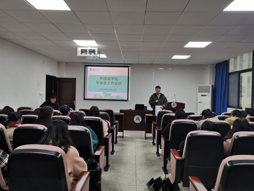 12月25日下午,外國語學院黨委在逸夫人文樓A2014會議室召開2020屆畢業(yè)班工作會議,學院黨委書記林二友在會上講話,黨委副書記占婧主持會議,輔導員冷自衍、畢業(yè)班班長、心理委員和就業(yè)聯(lián)絡人等學生干部參加會議。